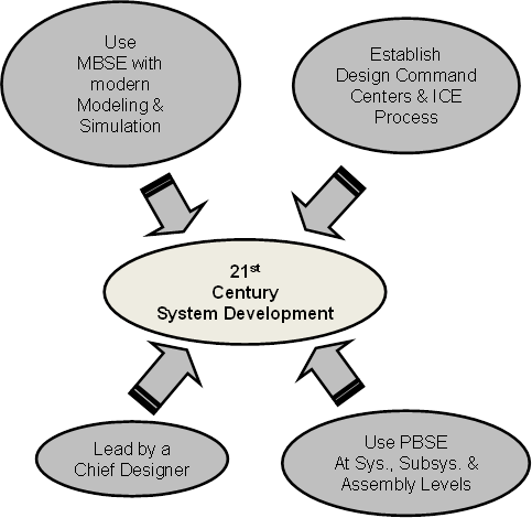 Figure 12-4 illustrates methods that can be synergistically integrated to achieve reductions in design time of factors of three to ten and cost reduction by factors of two to three. These benefits are not achieved instantly. Training is needed for teams to use these methods effectively. Investment is necessary to achieve the best results of PBSE and to push patterns down from the system level to subsystem and assembly levels. Ongoing investment is necessary to maintain the modeling, simulation, software development and CAD/CAM tools required to remain competitive. Document generation and document management tools are likely to require investments and training to effectively reduce engineering effort. Finally it must be recognized that systems engineering is going to continually evolve by inventing new processes and tools and by introducing new methods and tools for executing current processes.